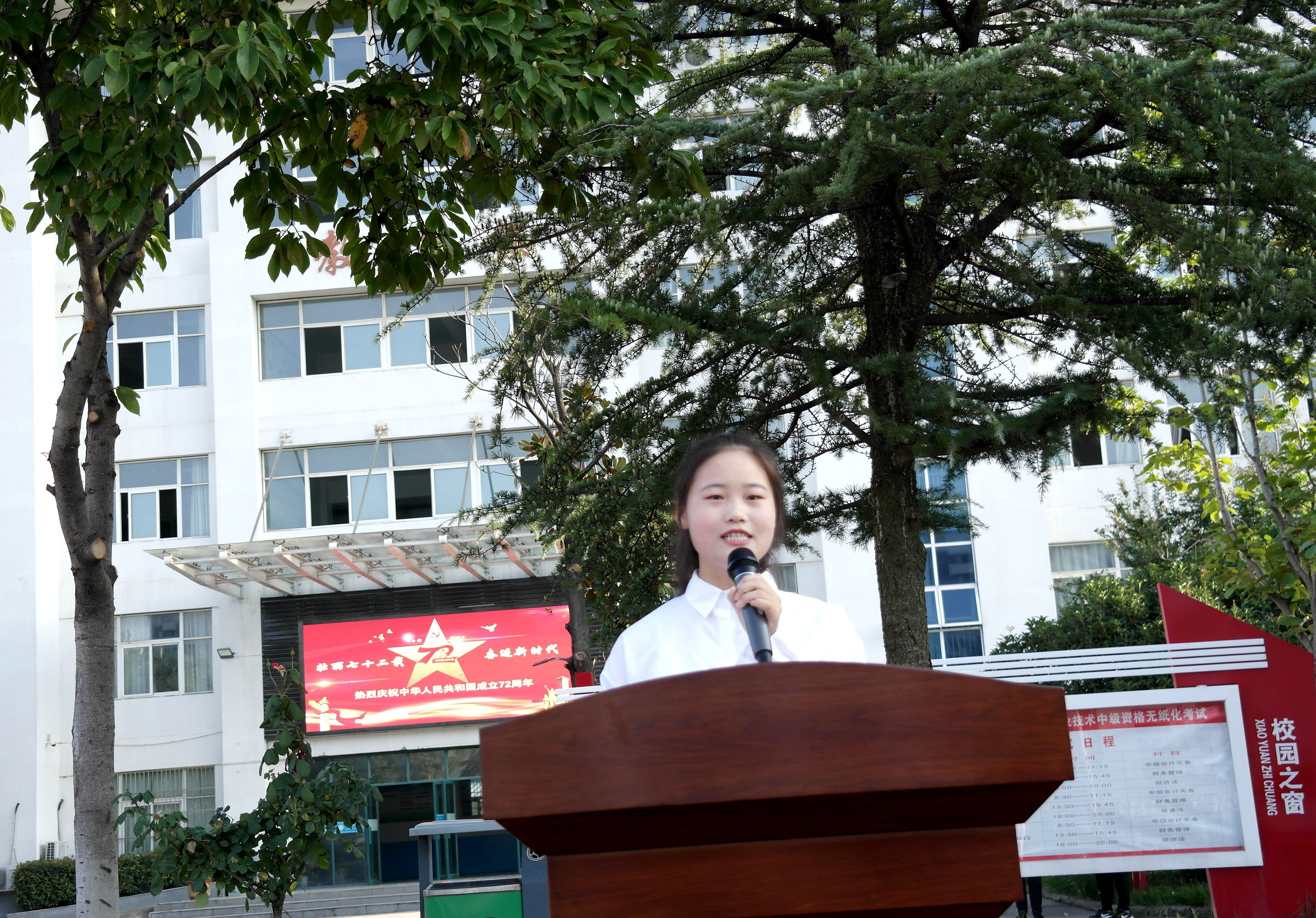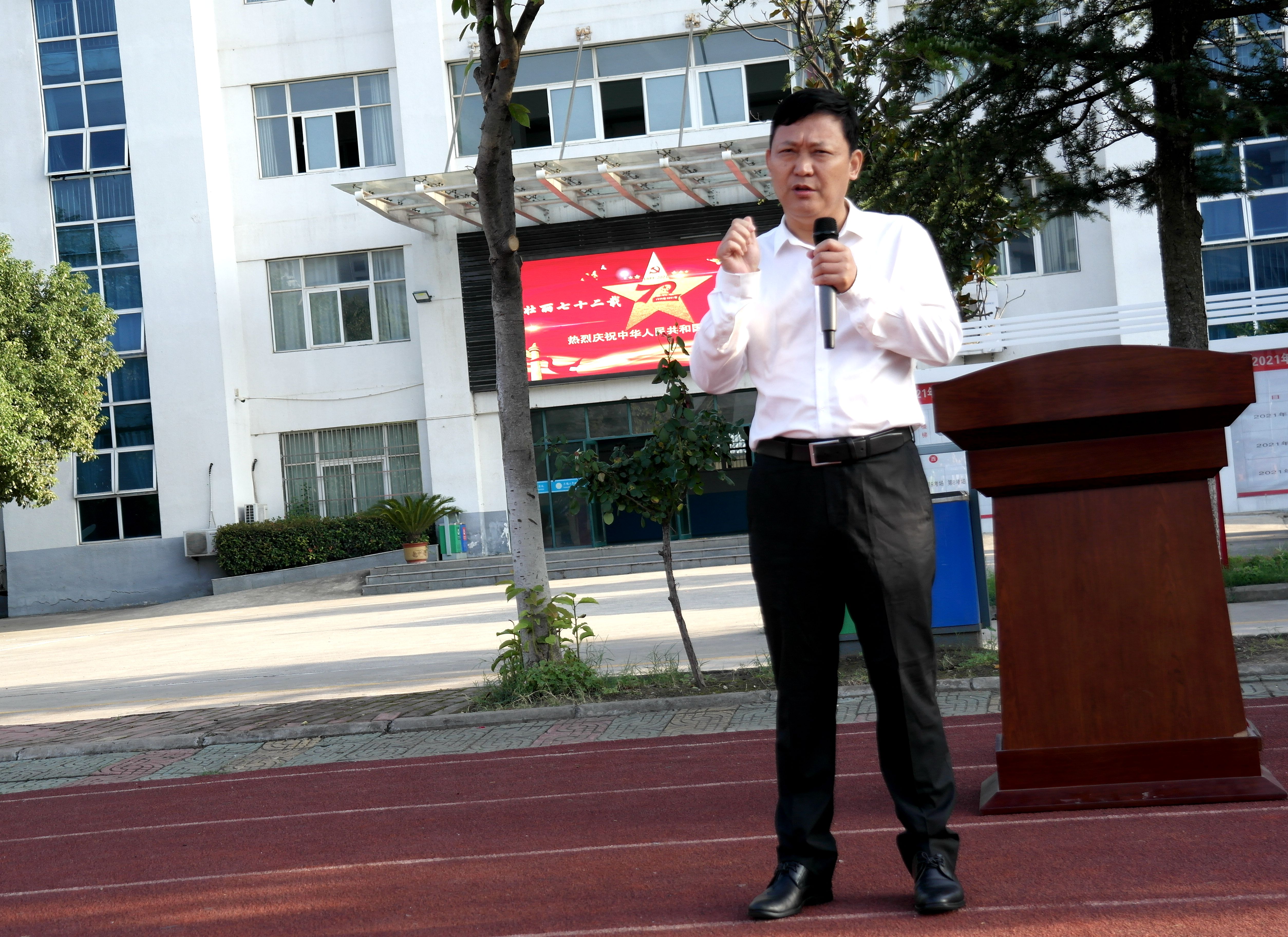 随后全体师生怀着对祖国的热爱,饱含深情同唱国歌,注视国旗冉冉升起。校微宣讲团成员丁清霜作了国旗下的“礼赞新中国 奋进新时代”主体宣讲,并联系学习党史和学习经历,激发同学们要以实现中华民族伟大复兴为已任,增强做中国人的志气、骨气、底气,不辜负党和人民的殷切希望。