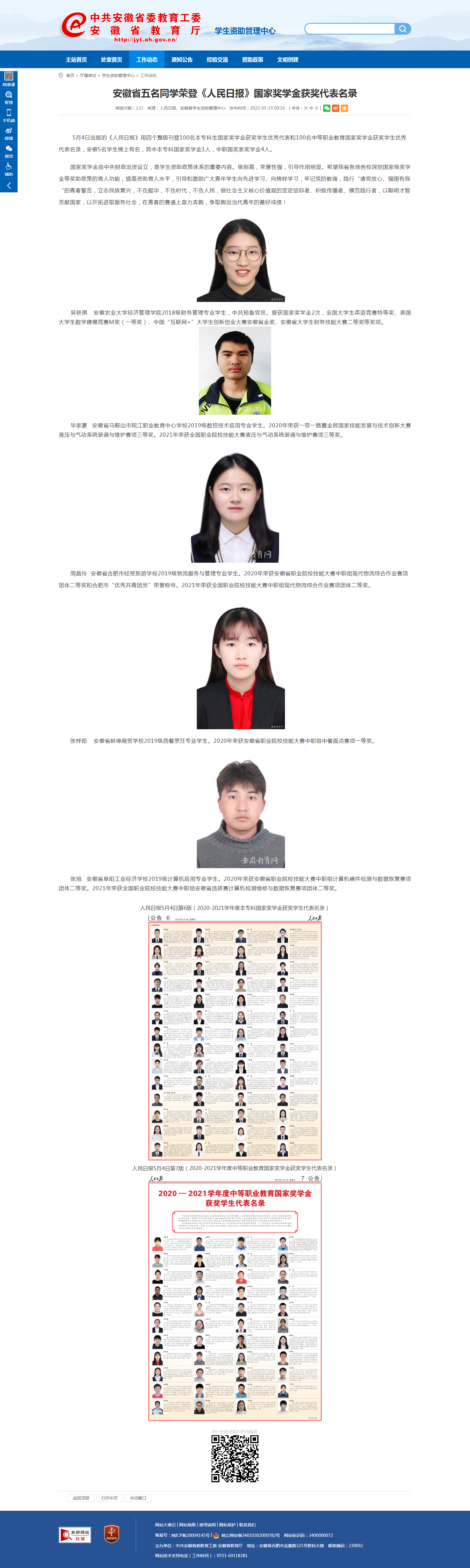 安徽省五名同学荣登《人民日报》国家奖学金获奖代表名录