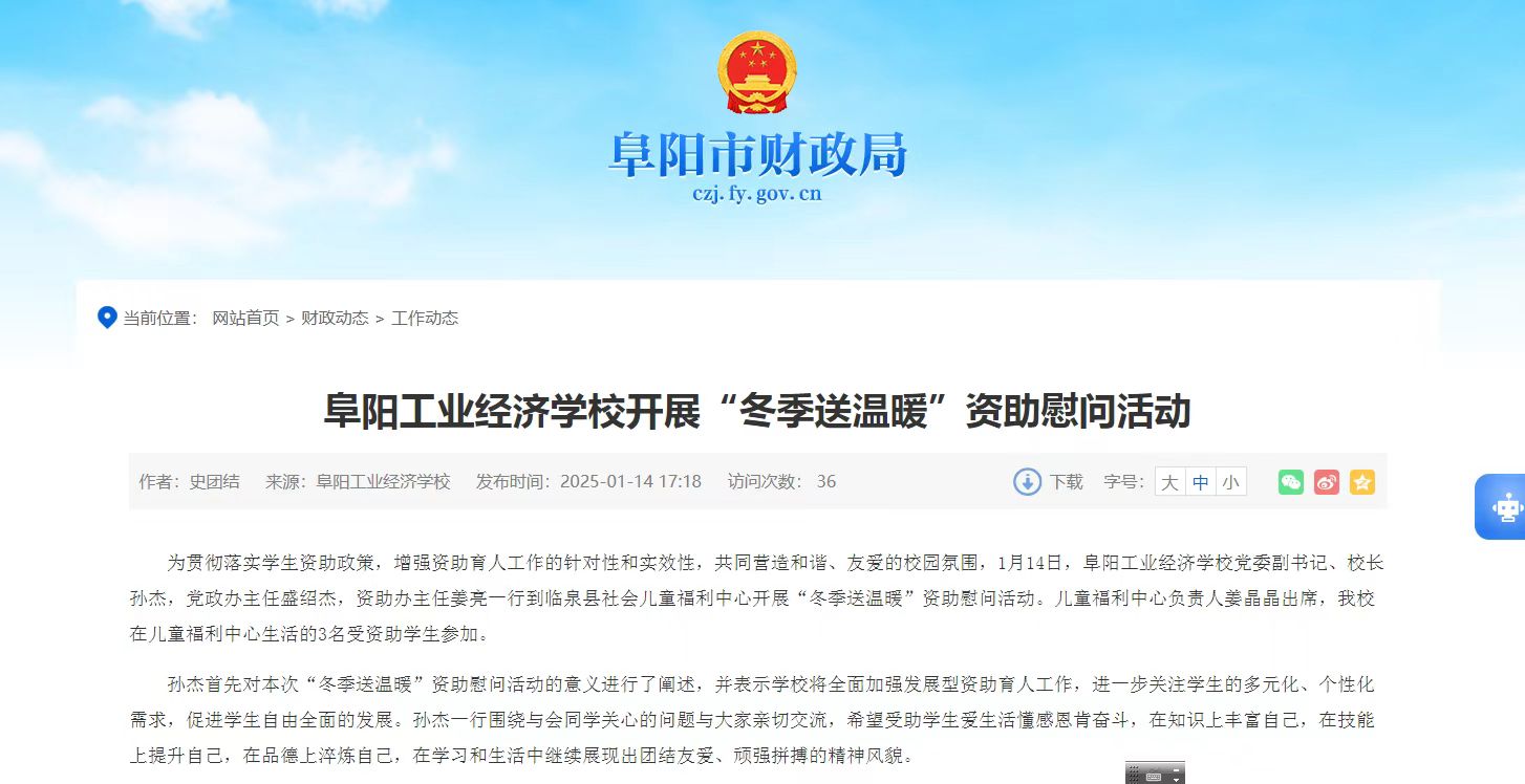 阜阳市财政局网站报道“阜阳工业经济学校开展‘冬季送温暖’资助慰问活动”
