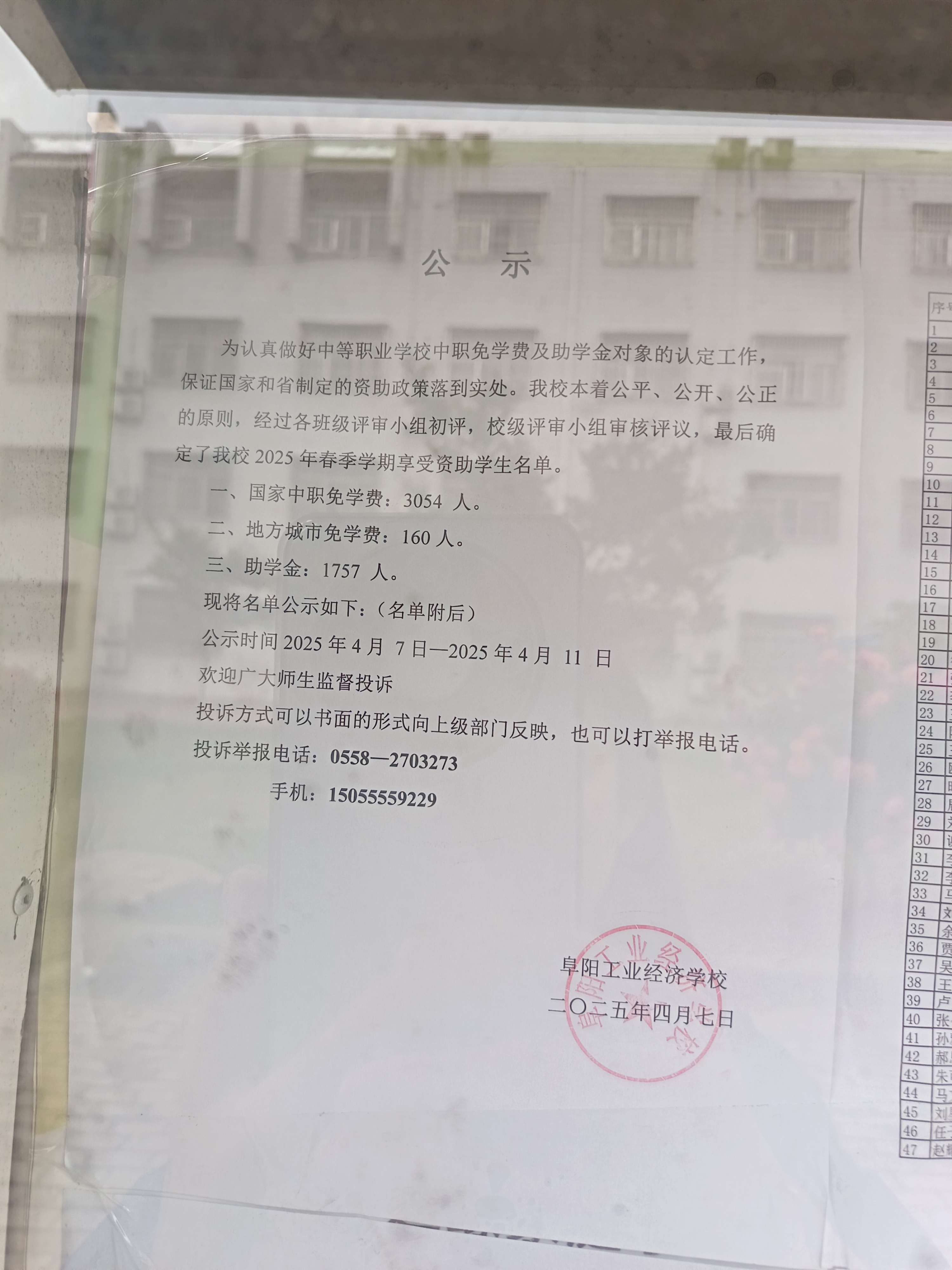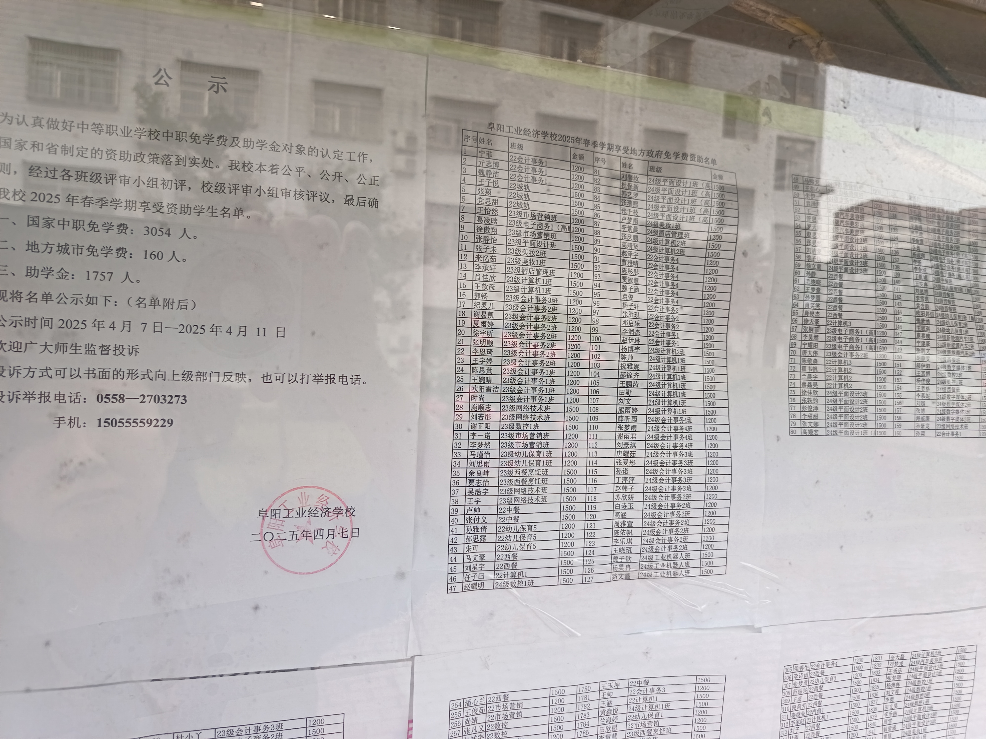 阜阳工业经济学校 2025年春季学期资助、免学费公示