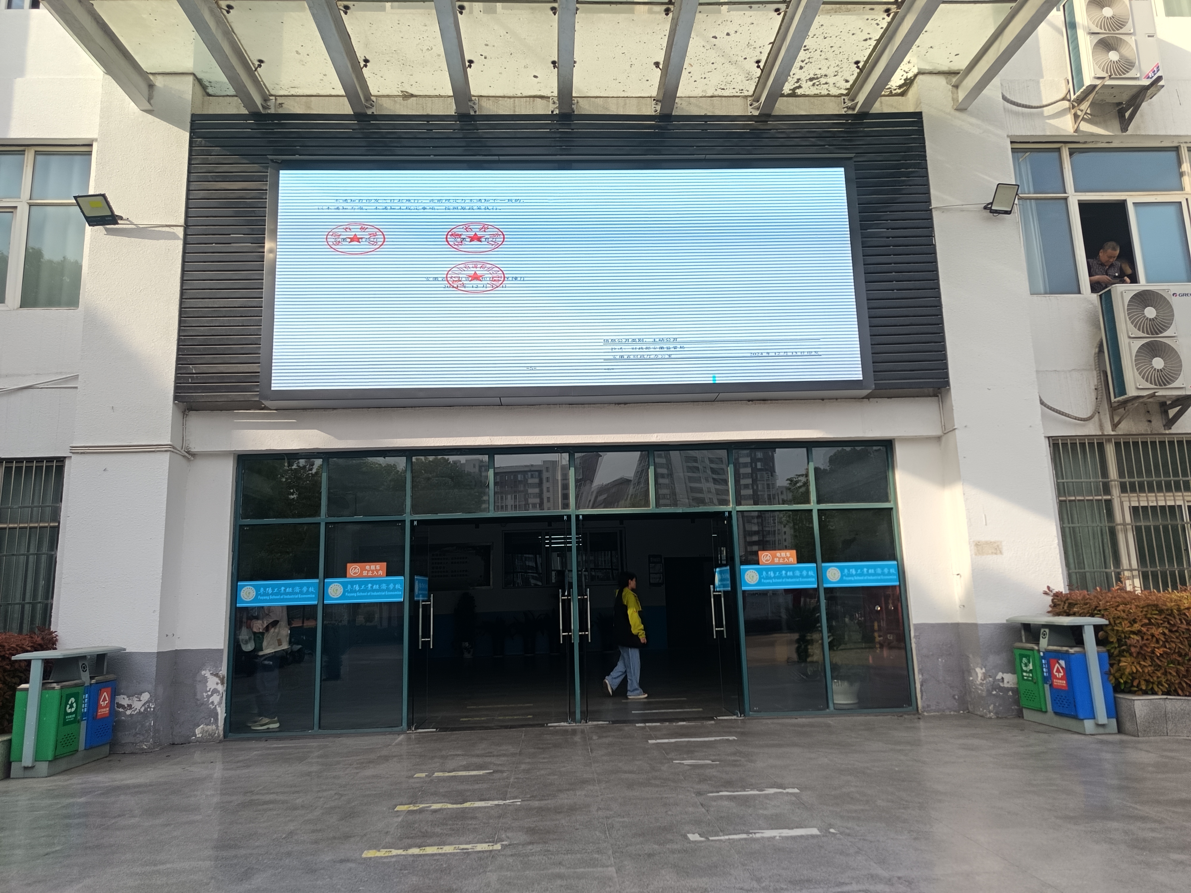 阜阳工业经济学校利用校园电子屏宣传《关于调整高等教育阶段和高中阶段国家奖助学金政策的通知》