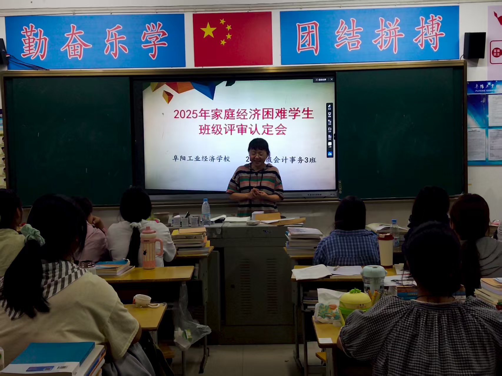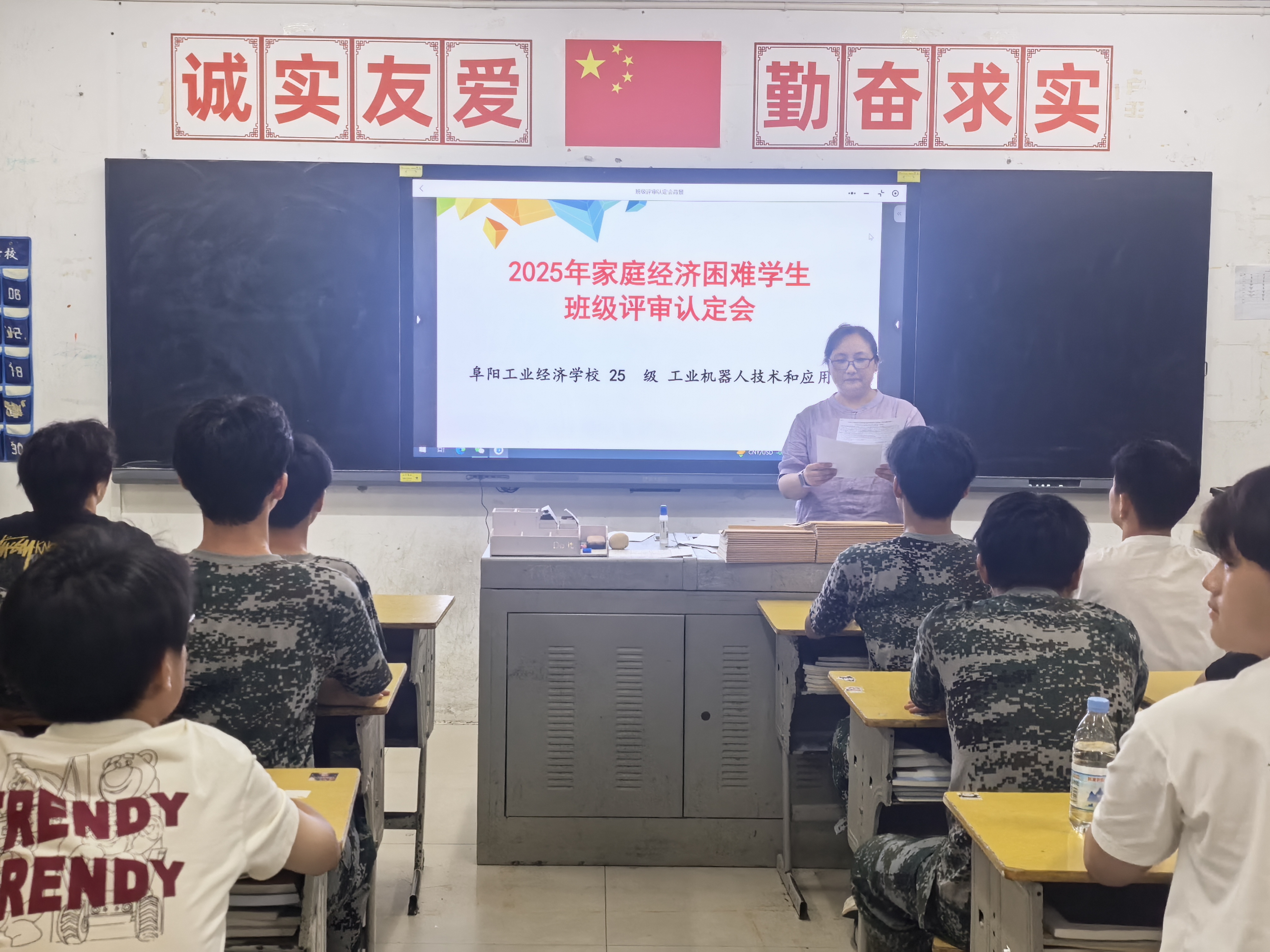 阜阳工业经济学校2025年秋季学期根据皖财教[2024]1252号文件、阜财教[2025]42号文件通知要求正式启动家庭经济困难学生班级评审认定工作。各班级按照校资助办公室工作要求利用晚自习时间召开国家助学金家庭经济困难学生评审认定会,班主任系统地讲解了国家助学金的认定办法、申请条件、标准、评审、申报流程及相关表格填写注意事项。